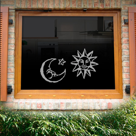 Das sehr schöne filigrane Motiv Sonne Mond eignet sich perfekt als Fensterdekorfolie. Das Motiv besteht aus einer hochwertigen mattierten PVC-Folie und ist in unterschiedlichen Folienarten in Sandstrahloptik, Milchglasoptik oder Ice Etched Optik erhältlich. Das Motiv wird freigestellt, sodass Sie den Effekt einer geschliffenen, sehr edlen Optik an der Glasfläche erhalten. Dieses Fensterdekor wird also nicht wie herkömmlich auf einer bedruckten, quadratischen, transparenten Folie geliefert. Somit kann das Dekor individuell auf der Glasfläche verklebt werden. Die Fensterfolie ist lichtdurchlässig und eignet sich hervorragend zur Dekoration von Fenstern oder anderen Glasflächen.